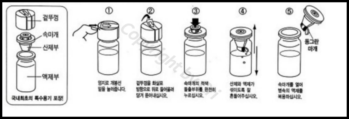 겉뚜껑 안에 속뚜껑이 있는데요. 그 안에 약제가 들어있습니다. 겉뚜껑을 개봉 후 속마개를 누르면 가루가 액체로 들어가는데요. 잘 흔들어서 드시면 됩니다.